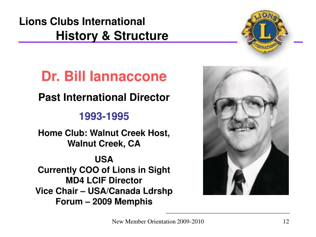 Lions Clubs International History & Structure Dr. Bill Iannaccone Past International Director 1993-1995 Home Club: Walnut Creek Host, Walnut Creek, CA USA Currently COO of Lions in Sight MD4 LCIF Director Vice Chair – USA/Canada Ldrshp Forum – 2009 Memphis New Member Orientation 2009-2010