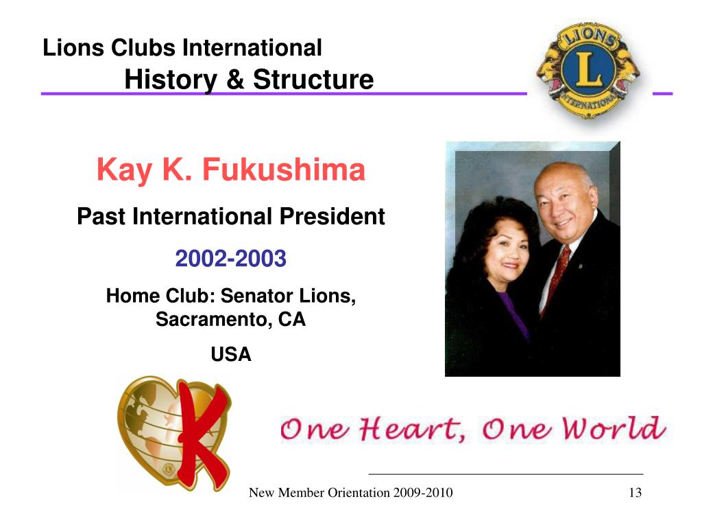 Lions Clubs International History & Structure Kay K. Fukushima Past International President 2002-2003 Home Club: Senator Lions, Sacramento, CA USA New Member Orientation 2009-2010