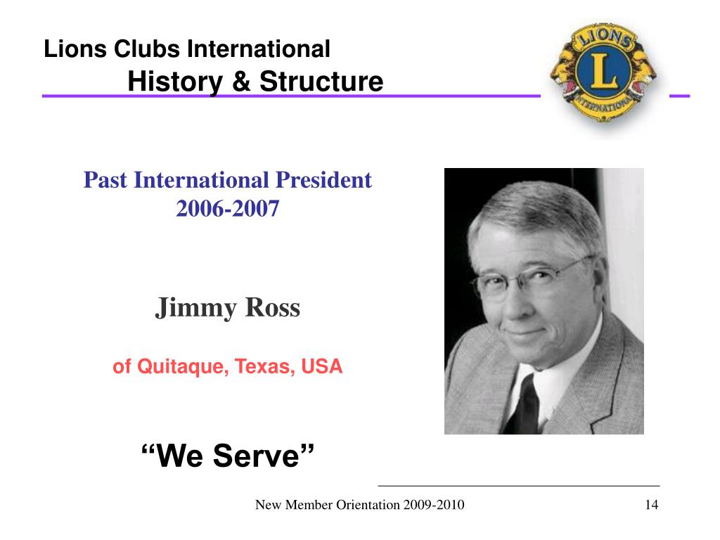 Lions Clubs International History & Structure Past International President 2006-2007 Jimmy Ross of Quitaque, Texas, USA “We Serve” New Member Orientation 2009-2010