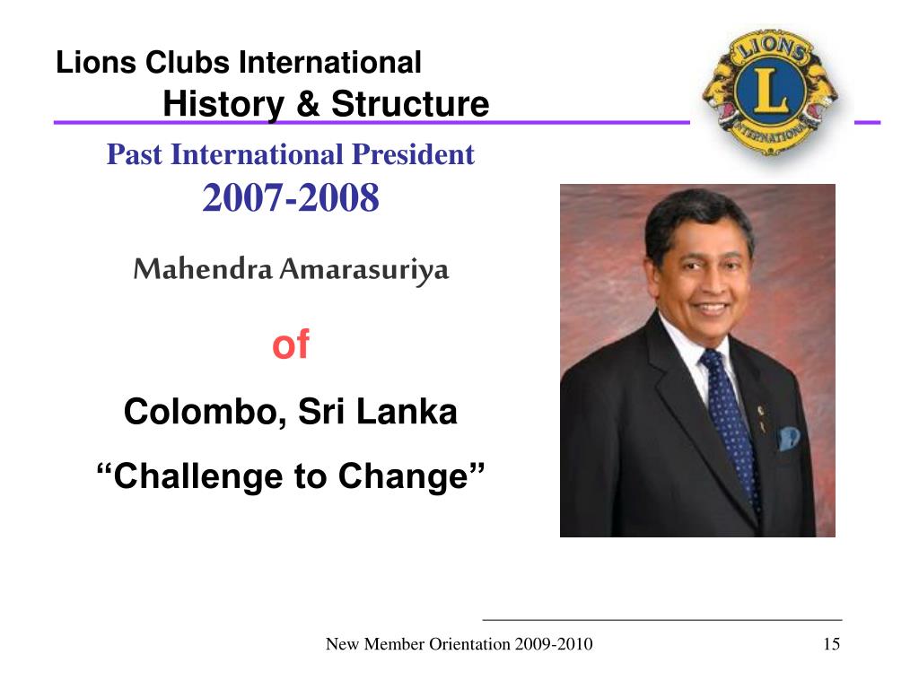 Lions Clubs International History & Structure Past International President2007-2008 Mahendra Amarasuriya of Colombo, Sri Lanka “Challenge to Change” New Member Orientation 2009-2010