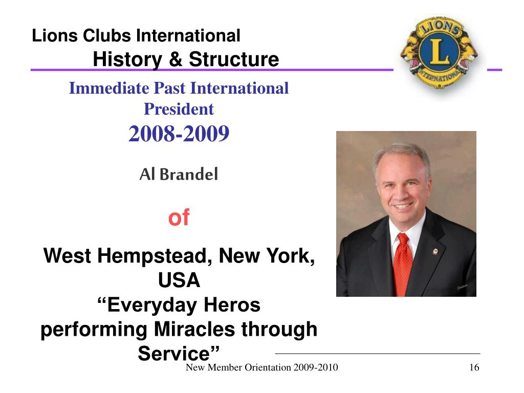 Lions Clubs International History & Structure Immediate Past International President 2008-2009 Al Brandel of West Hempstead, New York, USA “Everyday Heros performing Miracles through Service” New Member Orientation 2009-2010