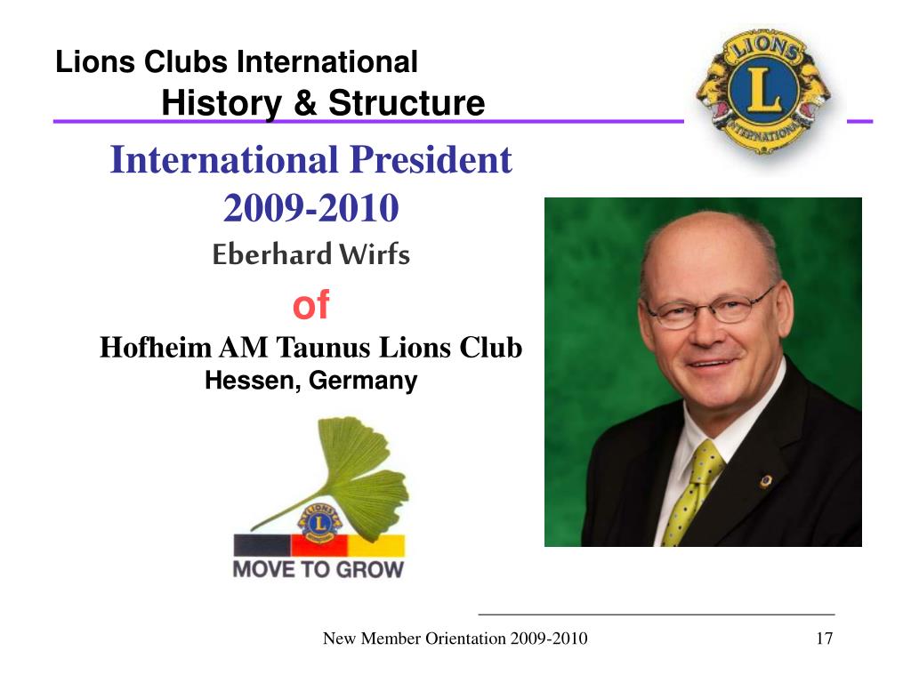 Lions Clubs International History & Structure International President 2009-2010 Eberhard Wirfs of Hofheim AM Taunus Lions ClubHessen, Germany New Member Orientation 2009-2010