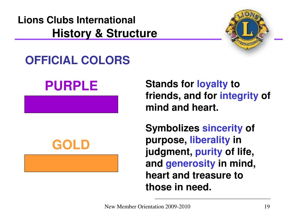 Lions Clubs International History & Structure OFFICIAL COLORS PURPLE Stands for loyalty to friends, and for integrity of mind and heart. Symbolizes sincerity of purpose, liberality in judgment, purity of life, and generosity in mind, heart and treasure to those in need. GOLD New Member Orientation 2009-2010