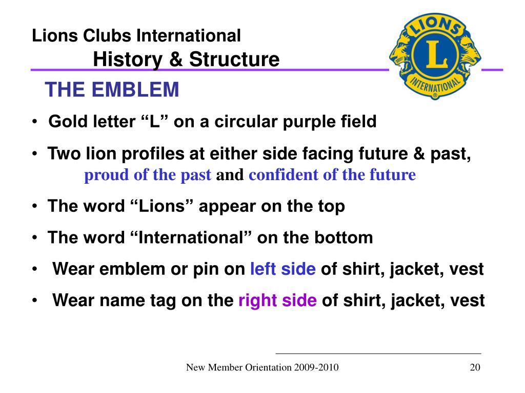 Lions Clubs International History & Structure THE EMBLEM • Gold letter “L” on a circular purple field • Two lion profiles at either side facing future & past, proud of the past and confident of the future • The word “Lions” appear on the top • The word “International” on the bottom • Wear emblem or pin on left side of shirt, jacket, vest • Wear name tag on the right side of shirt, jacket, vest New Member Orientation 2009-2010