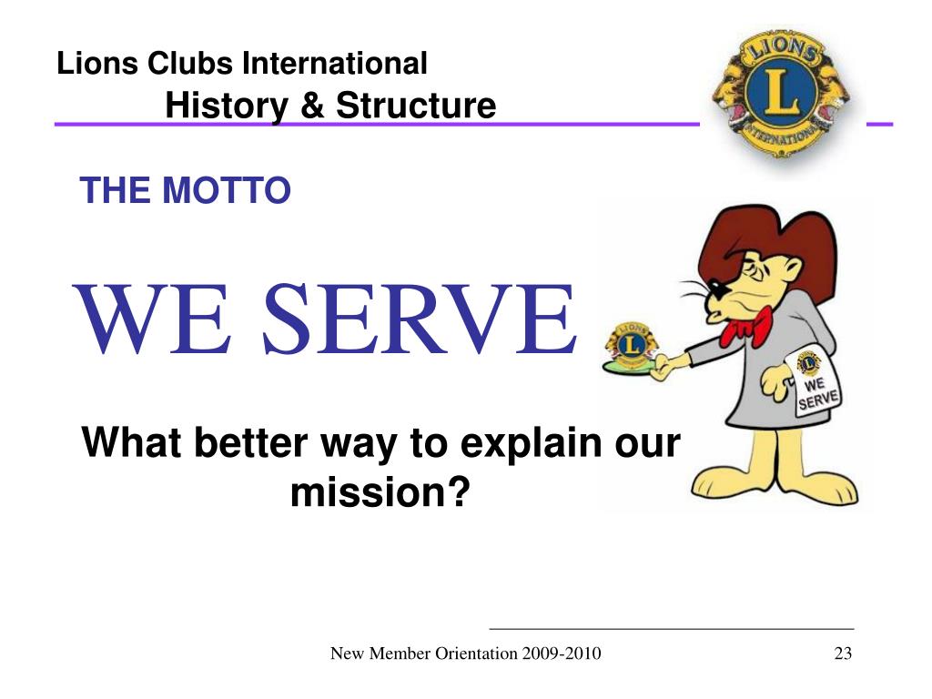Lions Clubs International History & Structure THE MOTTO WE SERVE What better way to explain our mission? New Member Orientation 2009-2010