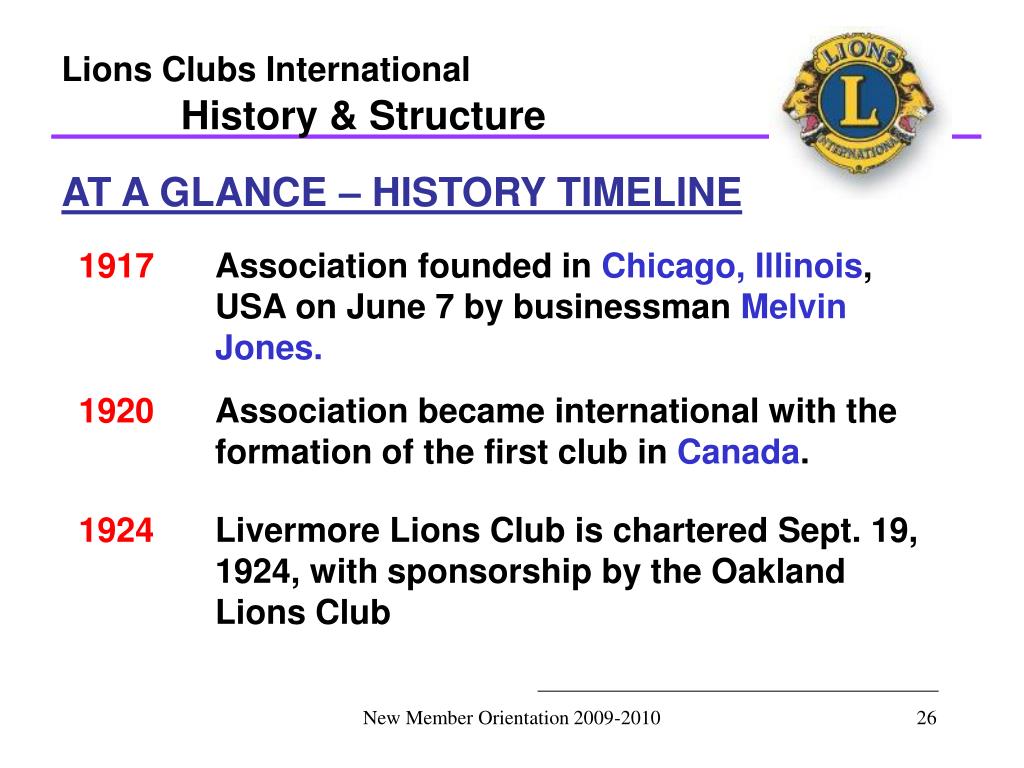 Lions Clubs International History & Structure AT A GLANCE – HISTORY TIMELINE 1917 Association founded in Chicago, Illinois, USA on June 7 by businessman Melvin Jones. 1920 Association became international with the formation of the first club in Canada. 1924 Livermore Lions Club is chartered Sept. 19, 1924, with sponsorship by the Oakland Lions Club New Member Orientation 2009-2010