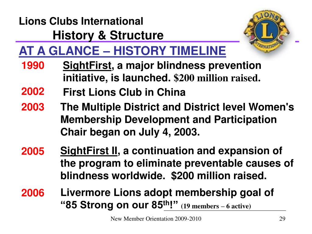 Lions Clubs International History & Structure AT A GLANCE – HISTORY TIMELINE 1990 SightFirst, a major blindness prevention initiative, is launched. $200 million raised. First Lions Club in China 2002 2003 The Multiple District and District level Women's Membership Development and Participation Chair began on July 4, 2003. SightFirst II, a continuation and expansion of the program to eliminate preventable causes of blindness worldwide. $200 million raised. Livermore Lions adopt membership goal of “85 Strong on our 85th!”(19 members – 6 active) 2005 2006 New Member Orientation 2009-2010