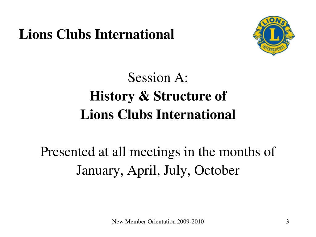 Lions Clubs International Session A: History & Structure of Lions Clubs International Presented at all meetings in the months of January, April, July, October New Member Orientation 2009-2010