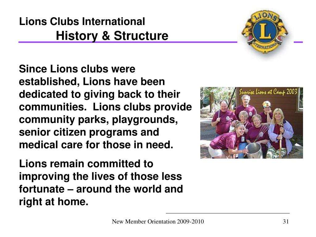 Lions Clubs International History & Structure Since Lions clubs were established, Lions have been dedicated to giving back to their communities. Lions clubs provide community parks, playgrounds, senior citizen programs and medical care for those in need. Lions remain committed to improving the lives of those less fortunate – around the world and right at home. New Member Orientation 2009-2010