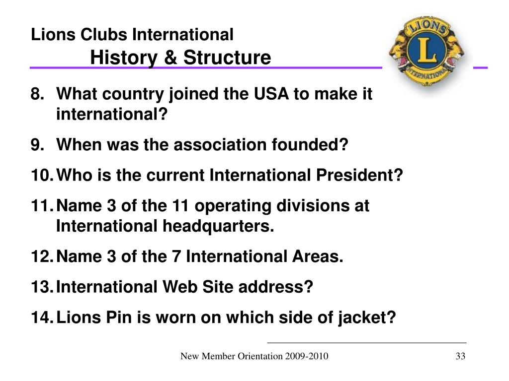 Lions Clubs International History & Structure • What country joined the USA to make it international? • When was the association founded? • Who is the current International President? • Name 3 of the 11 operating divisions at International headquarters. • Name 3 of the 7 International Areas. • International Web Site address? • Lions Pin is worn on which side of jacket? New Member Orientation 2009-2010