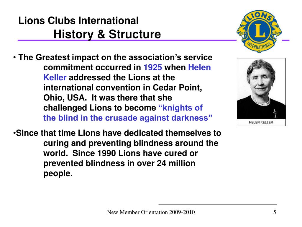 Lions Clubs International History & Structure AT A GLANCE – HISTORY TIMELINE 1925 Helen Keller challenges the Lions to become her “knights of the blind in the crusade against blindness.” 1935 First club in Latin America (Panama) chartered. 1945 Association helps form the Non-Governmental Organizations (NGO) section of the United Nation. 1947 First club in Australia chartered. New Member Orientation 2009-2010