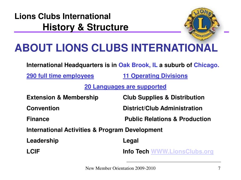 Lions Clubs International History & Structure ABOUT LIONS CLUBS INTERNATIONAL International Headquarters is in Oak Brook, IL a suburb of Chicago. 290 full time employees11 Operating Divisions 20 Languages are supported Extension & Membership Club Supplies & Distribution Convention District/Club Administration Finance Public Relations & Production International Activities & Program Development Leadership Legal LCIF Info Tech WWW.LionsClubs.org New Member Orientation 2009-2010
