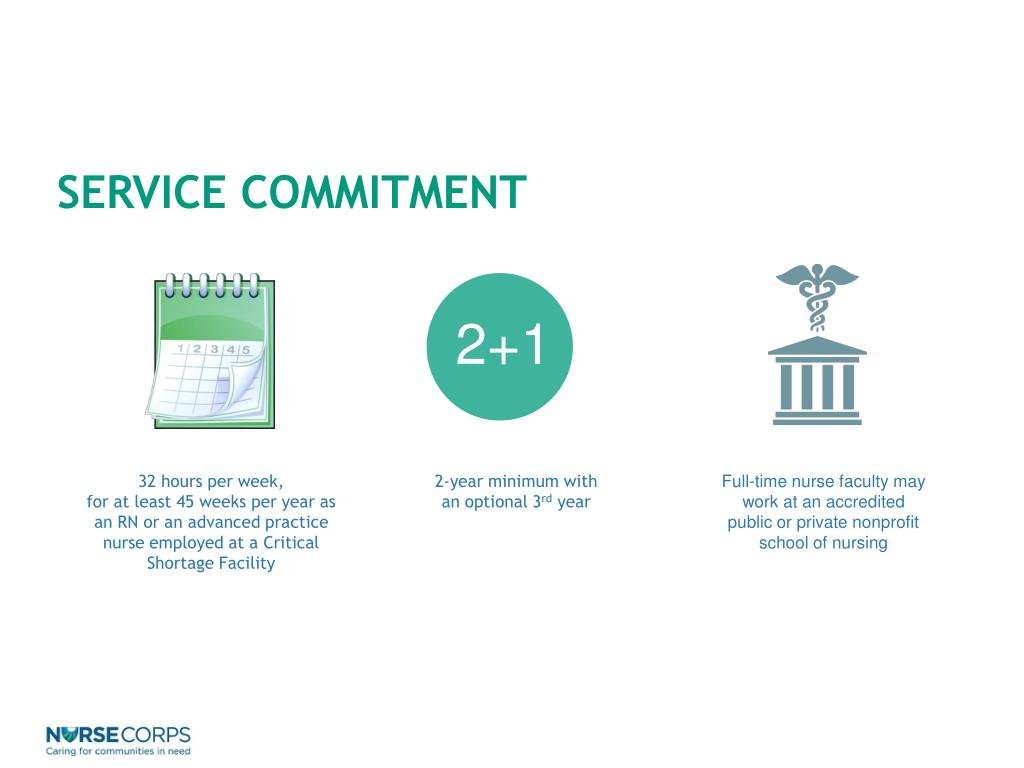 SERVICE COMMITMENT 32 hours per week, for at least 45 weeks per year as an RN or an advanced practice nurse employed at a Critical Shortage Facility 2-year minimum with an optional 3rd year Full-time nurse faculty may work at an accredited public or private nonprofit school of nursing 2+1