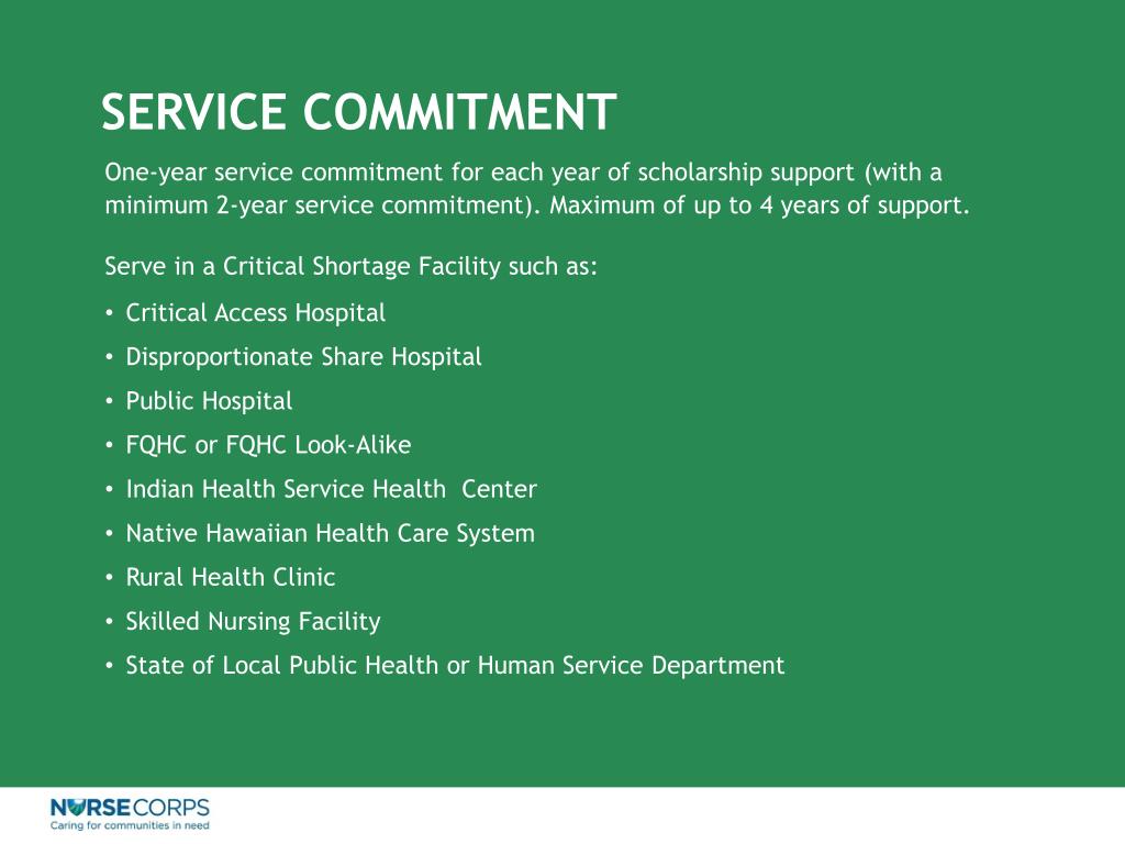 SERVICE COMMITMENT One-year service commitment for each year of scholarship support (with a minimum 2-year service commitment). Maximum of up to 4 years of support. Serve in a Critical Shortage Facility such as: • Critical Access Hospital • Disproportionate Share Hospital • Public Hospital • FQHC or FQHC Look-Alike • Indian Health Service Health Center • Native Hawaiian Health Care System • Rural Health Clinic • Skilled Nursing Facility • State of Local Public Health or Human Service Department