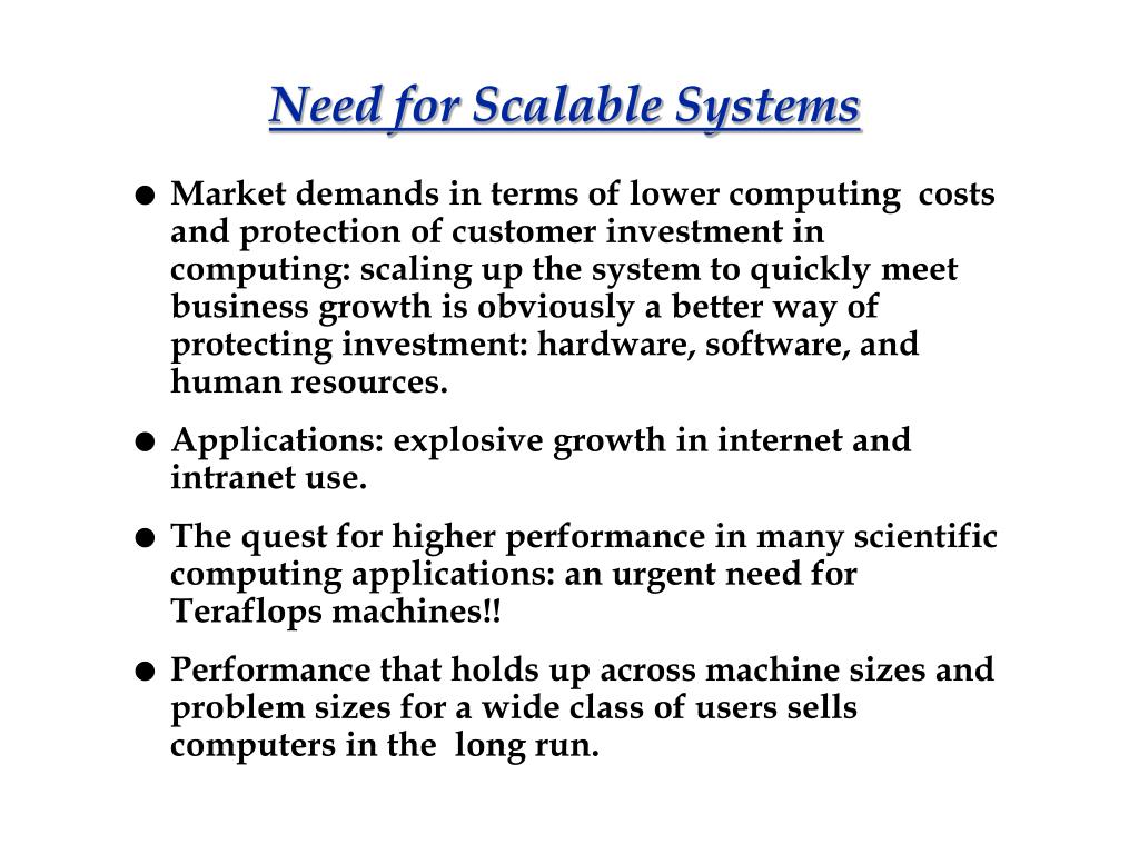 Need for Scalable Systems • Market demands in terms of lower computing costs and protection of customer investment in computing: scaling up the system to quickly meet business growth is obviously a better way of protecting investment: hardware, software, and human resources. • Applications: explosive growth in internet and intranet use. • The quest for higher performance in many scientific computing applications: an urgent need for Teraflops machines!! • Performance that holds up across machine sizes and problem sizes for a wide class of users sells computers in the long run.