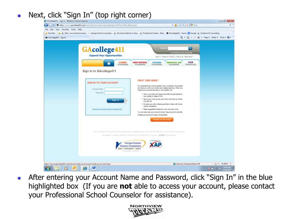 Next, click “Sign In” (top right corner) • After entering your Account Name and Password, click “Sign In” in the blue highlighted box (If you are not able to access your account, please contact your Professional School Counselor for assistance).