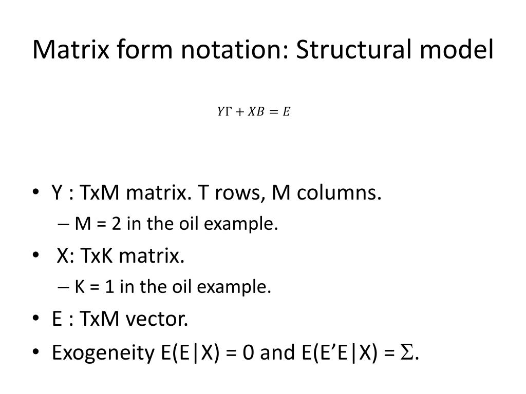 Matrix form notation: Structural model • Y : TxM matrix. T rows, M columns. • M = 2 in the oil example. • X: TxK matrix. • K = 1 in the oil example. • E : TxM vector. • Exogeneity E(E|X) = 0 and E(E’E|X) = S.