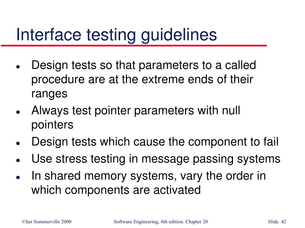 Interface testing guidelines • Design tests so that parameters to a called procedure are at the extreme ends of their ranges • Always test pointer parameters with null pointers • Design tests which cause the component to fail • Use stress testing in message passing systems • In shared memory systems, vary the order in which components are activated