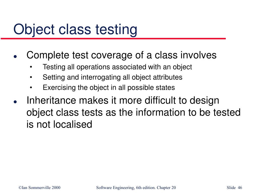 Object class testing • Complete test coverage of a class involves • Testing all operations associated with an object • Setting and interrogating all object attributes • Exercising the object in all possible states • Inheritance makes it more difficult to design object class tests as the information to be tested is not localised