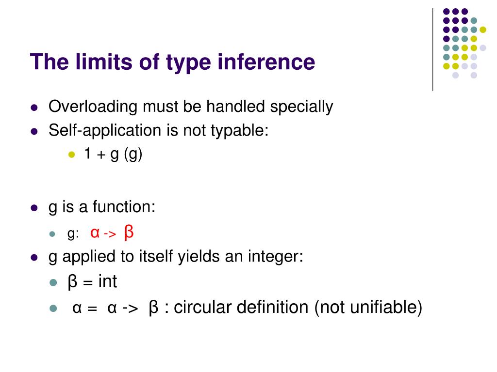 The limits of type inference • Overloading must be handled specially • Self-application is not typable: • 1 + g (g) • g is a function: • g: α -> β • g applied to itself yields an integer: • β = int • α = α -> β : circular definition (not unifiable)