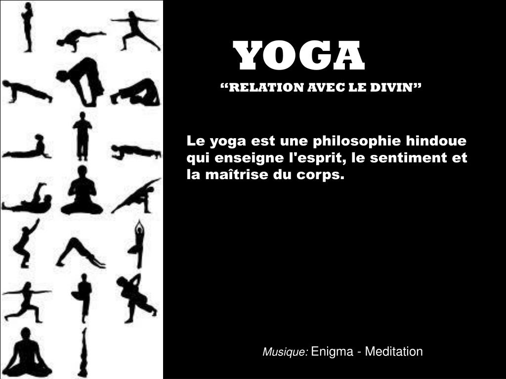 YOGA “RELATION AVEC LE DIVIN”. Le yoga est une philosophie hindoue qui enseigne l'esprit, le sentiment et la maîtrise du corps. Musique: Enigma - Meditation . FIN. Vu sur humourpps.com.
