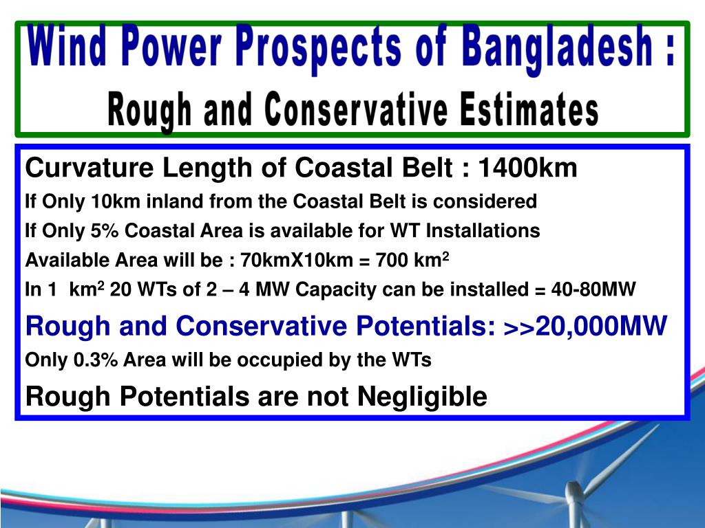 Wind Power Prospects of Bangladesh : Rough and Conservative Estimates Curvature Length of Coastal Belt : 1400km If Only 10km inland from the Coastal Belt is considered If Only 5% Coastal Area is available for WT Installations Available Area will be : 70kmX10km = 700 km2 In 1 km2 20 WTs of 2 – 4 MW Capacity can be installed = 40-80MW Rough and Conservative Potentials: >>20,000MW Only 0.3% Area will be occupied by the WTs Rough Potentials are not Negligible