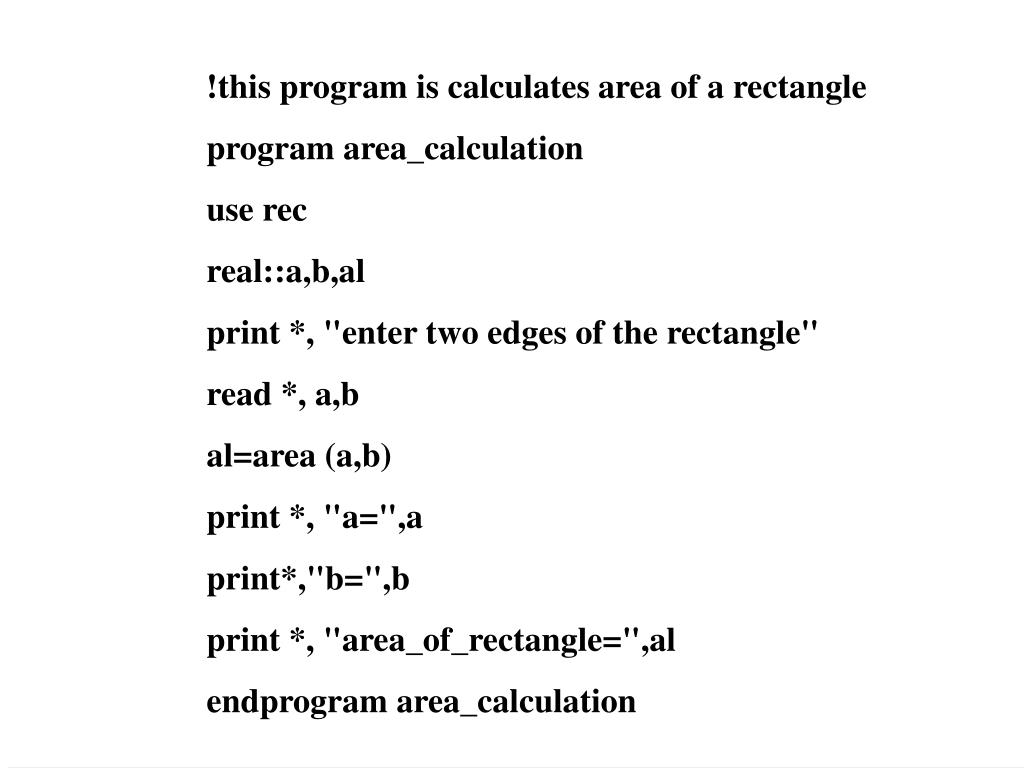 !this program is calculates area of a rectangle program area_calculation use rec real::a,b,al print *, "enter two edges of the rectangle" read *, a,b al=area (a,b) print *, "a=",a print*,"b=",b print *, "area_of_rectangle=",al endprogram area_calculation