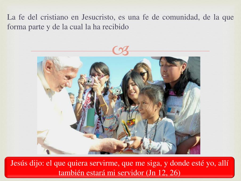 La fe del cristiano en Jesucristo, es una fe de comunidad, de la que forma parte y de la cual la ha recibido Jesús dijo: el que quiera servirme, que me siga, y donde esté yo, allí también estará mi servidor (Jn 12, 26)