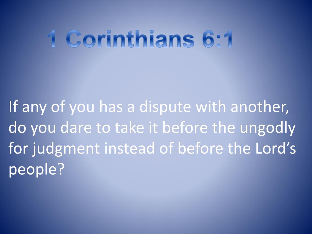 Legal Disputes & Immorality. 1 Corinthians 6:1-20. 1 Corinthians 6:1. If any of you has a dispute with another, do you dare to take it before the ungodly for judgment instead of before the Lord’s people?. 1 Corinthians 6:6.