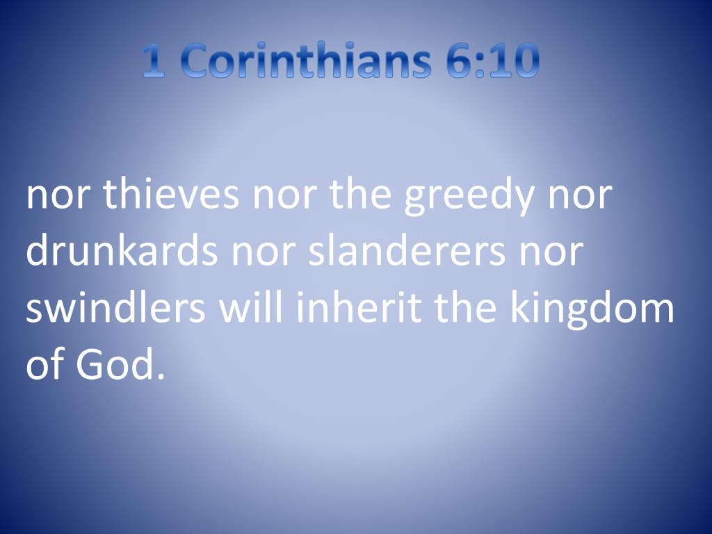 1 Corinthians 6:10 nor thieves nor the greedy nor drunkards nor slanderers nor swindlers will inherit the kingdom of God.