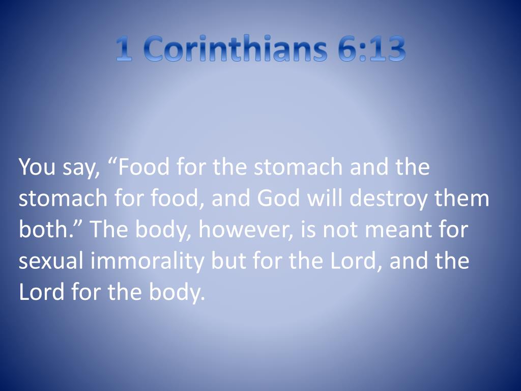 1 Corinthians 6:13 You say, “Food for the stomach and the stomach for food, and God will destroy them both.” The body, however, is not meant for sexual immorality but for the Lord, and the Lord for the body.