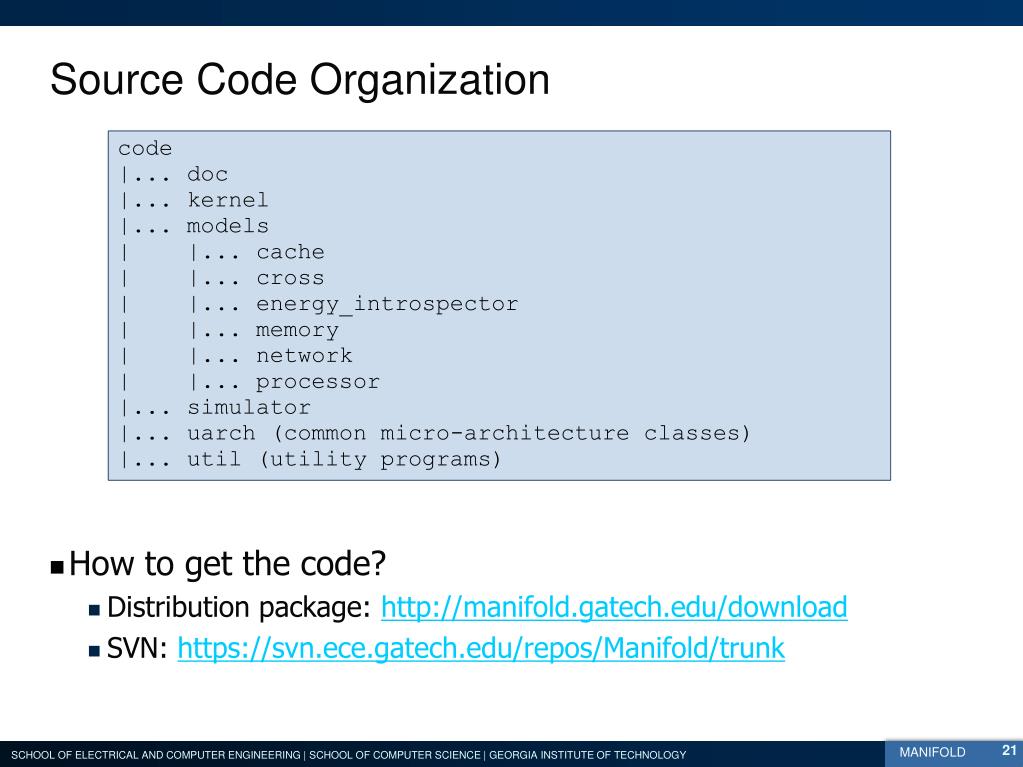 Source Code Organization code |... doc |... kernel |... models | |... cache | |... cross | |... energy_introspector | |... memory | |... network | |... processor |... simulator |... uarch (common micro-architecture classes) |... util (utility programs) • How to get the code? • Distribution package: http://manifold.gatech.edu/download • SVN: https://svn.ece.gatech.edu/repos/Manifold/trunk