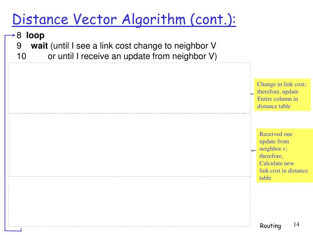 Distance Vector Algorithm (cont.): 8 loop 9 wait (until I see a link cost change to neighbor V 10 or until I receive an update from neighbor V) 11 //link cost change 12 if (c(X,V) changes by d) 13 /* change cost to all dest's via neighbor v by d */ 14 /* note: d could be positive or negative */ 15 for all destinations y: D (y,V) = D (y,V) + d 16 //receipt of routing table from neighbor V 17 else if (update received from V wrt destination Y) 18 /* shortest path from V to some Y has changed */ 19 /* V has sent a new value for its min DV(Y,w) */ 20 /* call this received new value as newval */ 21 for the single destination y: D (Y,V) = c(X,V) + newval 22 //new least-cost to any destination Y found 23 ifwe have a new min D (Y,w) for any destination Y 24 send new value of min D (Y,w) to all neighbors 25 26 forever Change in link cost; therefore, update Entire column in distance table X X Received one update from neighbor v; therefore, Calculate new link cost in distance table w X X w X w