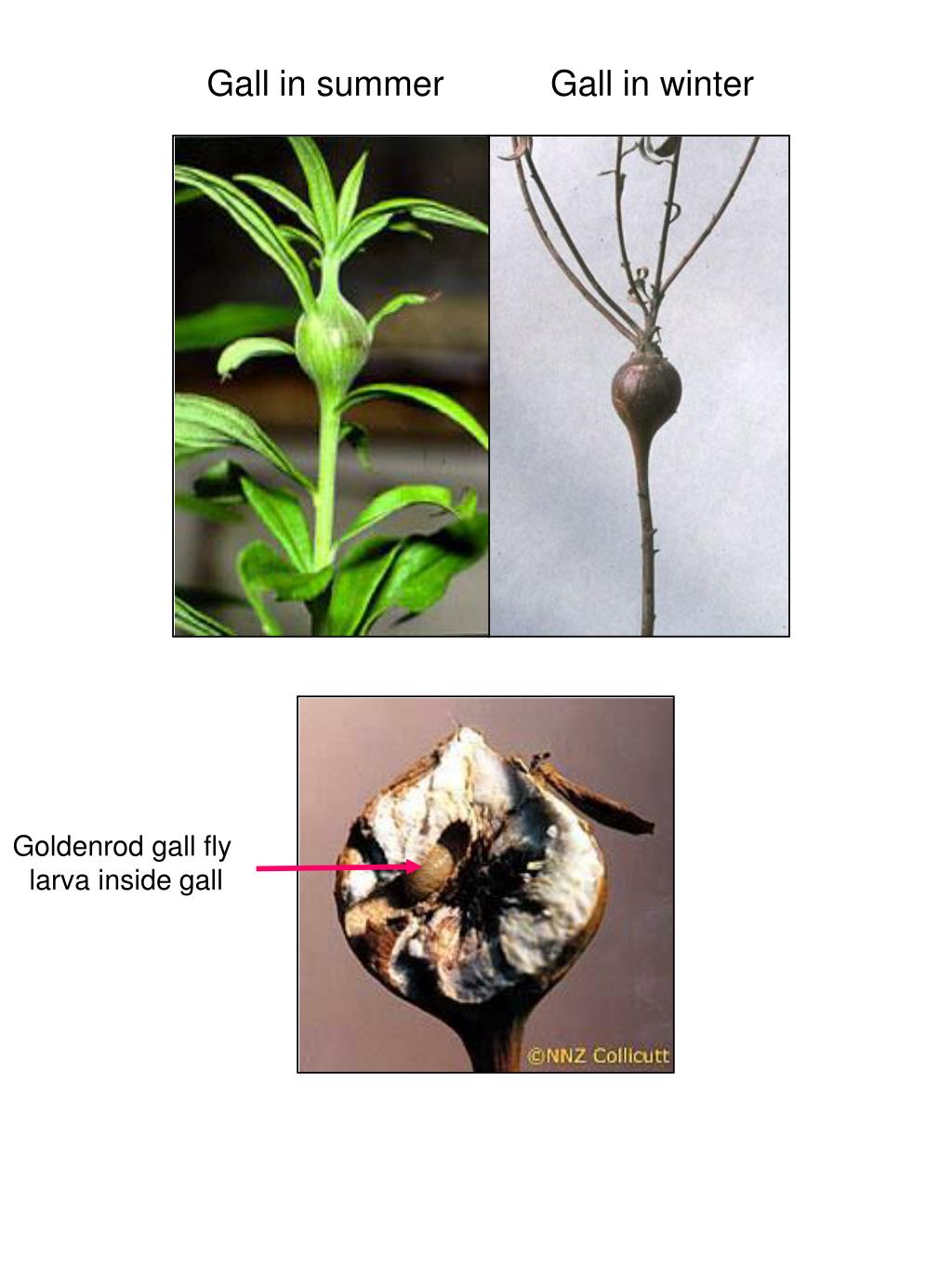 Gall in summer Gall in winter Goldenrod gall fly larva inside gall