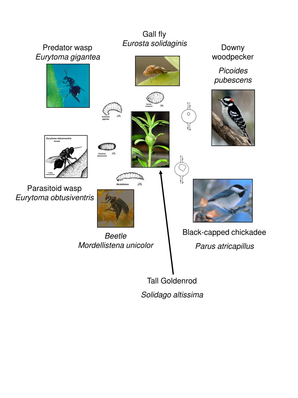 Gall fly Eurosta solidaginis Downy woodpecker Picoides pubescens Predator wasp Eurytoma gigantea Parasitoid wasp Eurytoma obtusiventris Black-capped chickadee Parus atricapillus Beetle Mordellistena unicolor Tall Goldenrod Solidago altissima