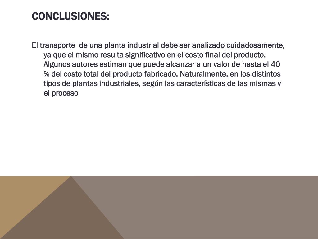 CONCLUSIONES: • El transporte de una planta industrial debe ser analizado cuidadosamente, ya que el mismo resulta significativo en el costo final del producto. Algunos autores estiman que puede alcanzar a un valor de hasta el 40 % del costo total del producto fabricado. Naturalmente, en los distintos tipos de plantas industriales, según las características de las mismas y el proceso
