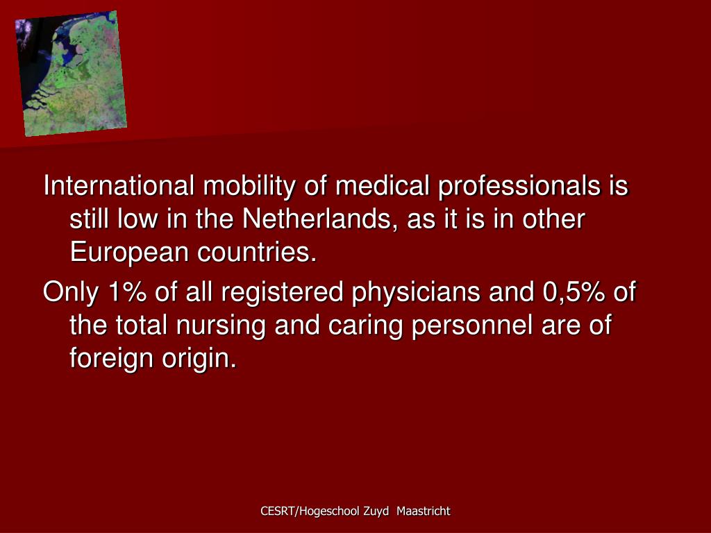 International mobility of medical professionals is still low in the Netherlands, as it is in other European countries. Only 1% of all registered physicians and 0,5% of the total nursing and caring personnel are of foreign origin. CESRT/Hogeschool Zuyd Maastricht