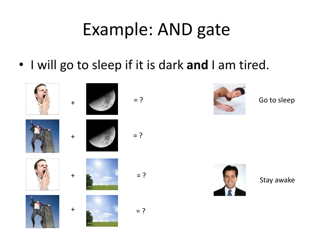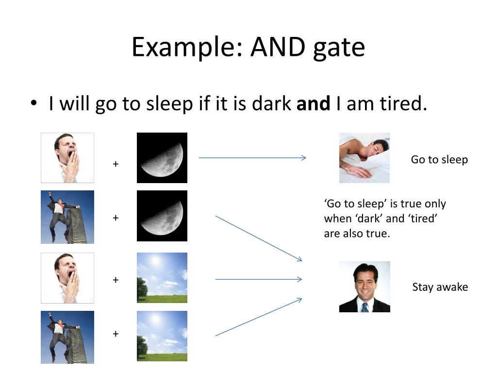 Example: AND gate • I will go to sleep if it is dark and I am tired. Go to sleep + ‘Go to sleep’ is true only when ‘dark’ and ‘tired’ are also true. + + Stay awake +