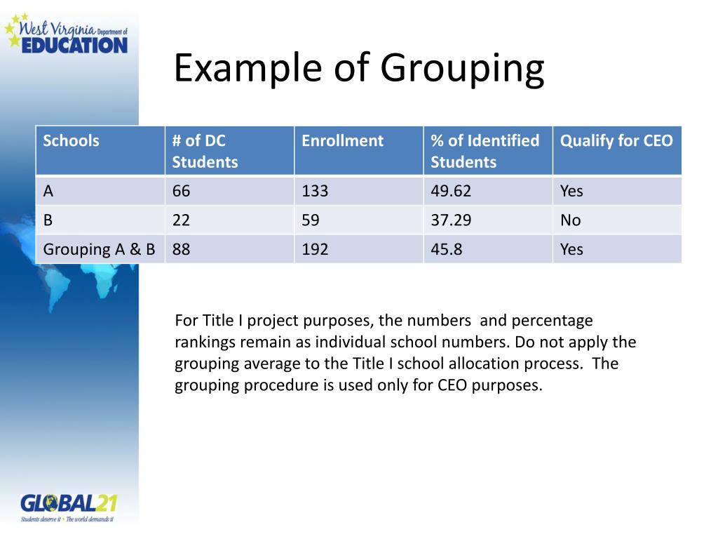 Example of Grouping For Title I project purposes, the numbers and percentage rankings remain as individual school numbers. Do not apply the grouping average to the Title I school allocation process. The grouping procedure is used only for CEO purposes.