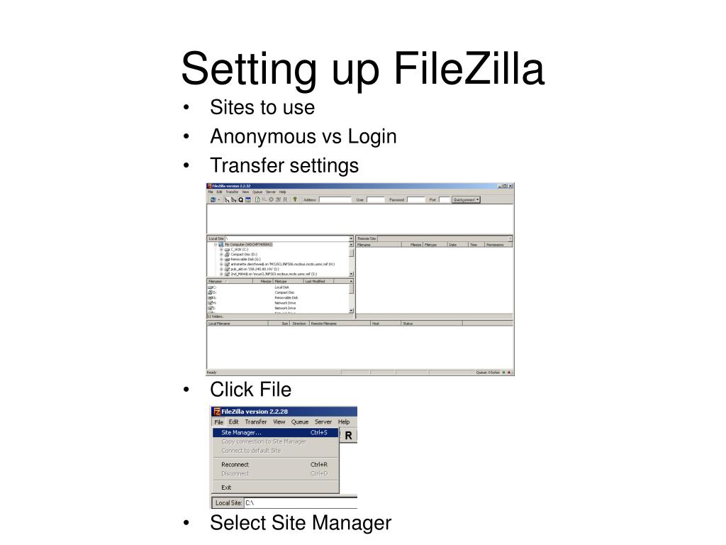 Setting up FileZilla • Sites to use • Anonymous vs Login • Transfer settings • Click File • Select Site Manager