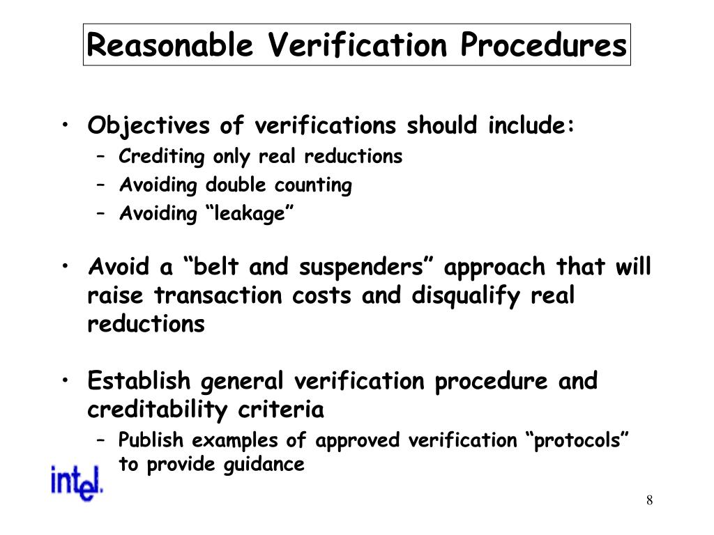 Reasonable Verification Procedures • Objectives of verifications should include: • Crediting only real reductions • Avoiding double counting • Avoiding “leakage” • Avoid a “belt and suspenders” approach that will raise transaction costs and disqualify real reductions • Establish general verification procedure and creditability criteria • Publish examples of approved verification “protocols” to provide guidance