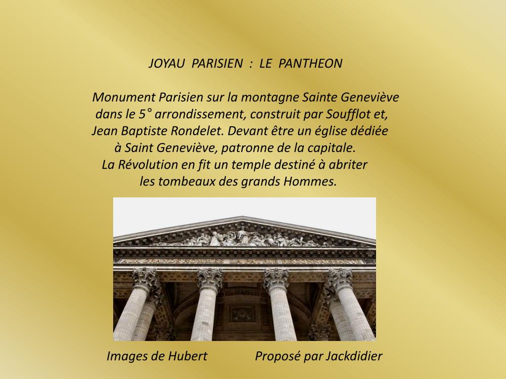 JOYAU PARISIEN : LE PANTHEON Monument Parisien sur la montagne Sainte Geneviève dans le 5° arrondissement, construit par Soufflot et, Jean Baptiste Rondelet. Devant être un église dédiée à Saint Geneviève, patronne de la capitale. La Révolution en fit un temple destiné à abriter les tombeaux des grands Hommes. Images de Hubert Proposé par Jackdidier