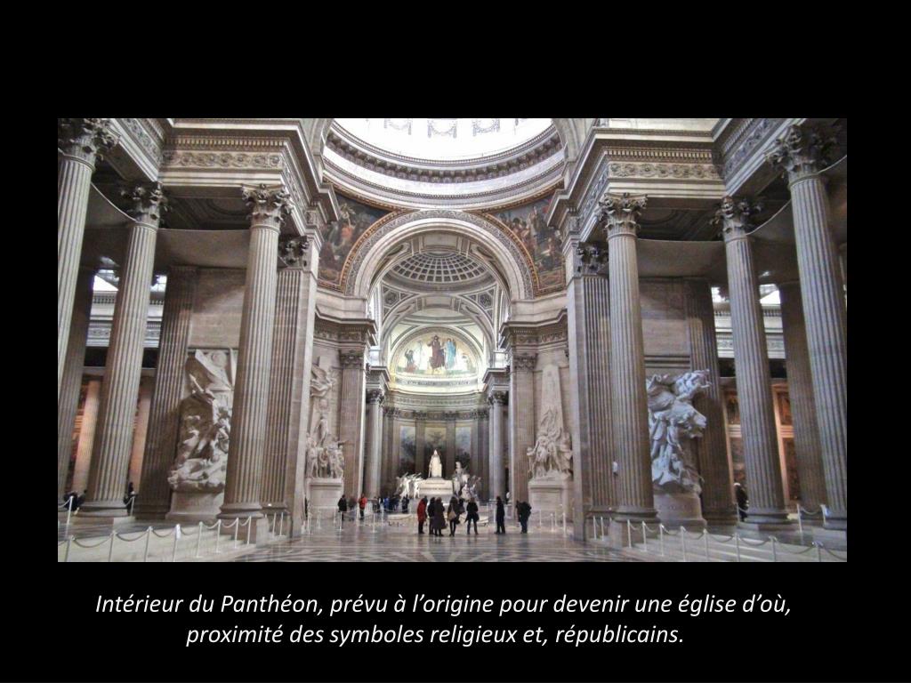 Intérieur du Panthéon, prévu à l’origine pour devenir une église d’où, proximité des symboles religieux et, républicains.