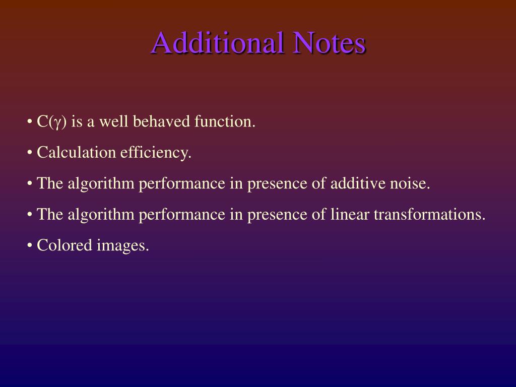 Additional Notes • C(g) is a well behaved function. • Calculation efficiency. • The algorithm performance in presence of additive noise. • The algorithm performance in presence of linear transformations. • Colored images.