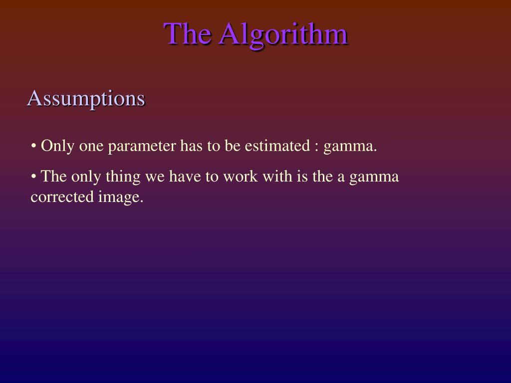 The Algorithm Assumptions • Only one parameter has to be estimated : gamma. • The only thing we have to work with is the a gamma corrected image.