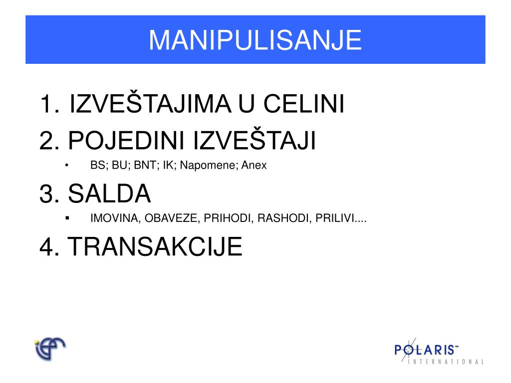 MANIPULISANJE • IZVEŠTAJIMA U CELINI 2. POJEDINI IZVEŠTAJI • BS; BU; BNT; IK; Napomene; Anex 3. SALDA • IMOVINA, OBAVEZE, PRIHODI, RASHODI, PRILIVI.... 4. TRANSAKCIJE