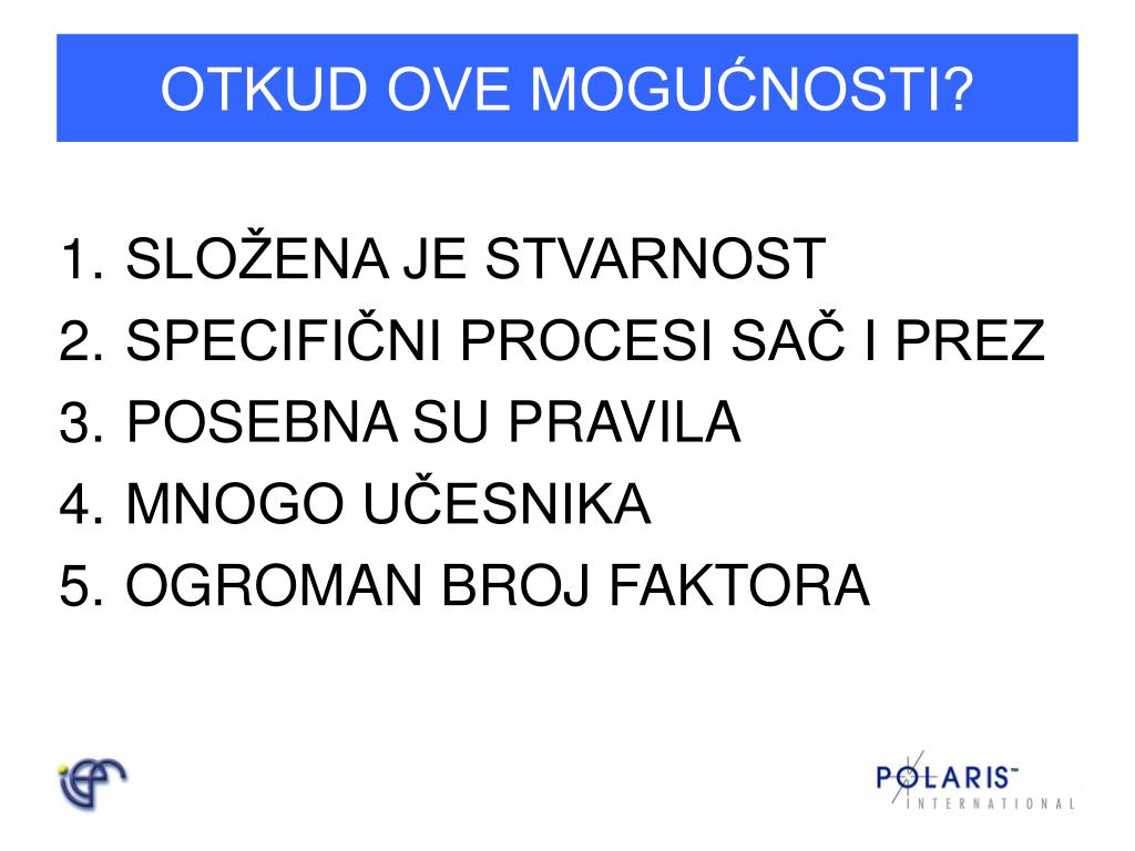 OTKUD OVE MOGUĆNOSTI? • SLOŽENA JE STVARNOST • SPECIFIČNI PROCESI SAČ I PREZ • POSEBNA SU PRAVILA • MNOGO UČESNIKA • OGROMAN BROJ FAKTORA