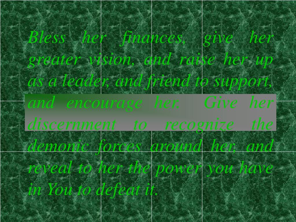 Bless her finances, give her greater vision, and raise her up as a leader, and friend to support, and encourage her. Give her discernment to recognize the demonic forces around her, and reveal to her the power you have in You to defeat it.