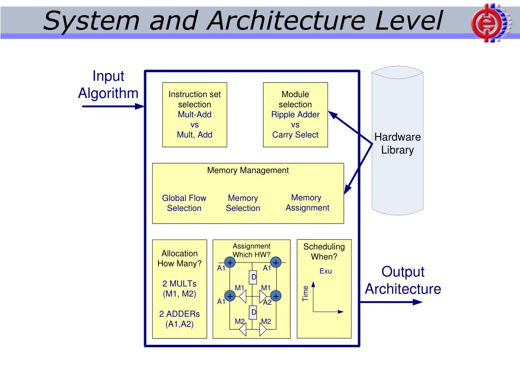 System and Architecture Level Design partitioning – spectral partitioning Spectral Partitioning places computational nodes on 1-D axis based on “closeness” — identifies candidates for clustering Partitioning may lead to extra hardware units. This does not necessarily mean an increase in area!