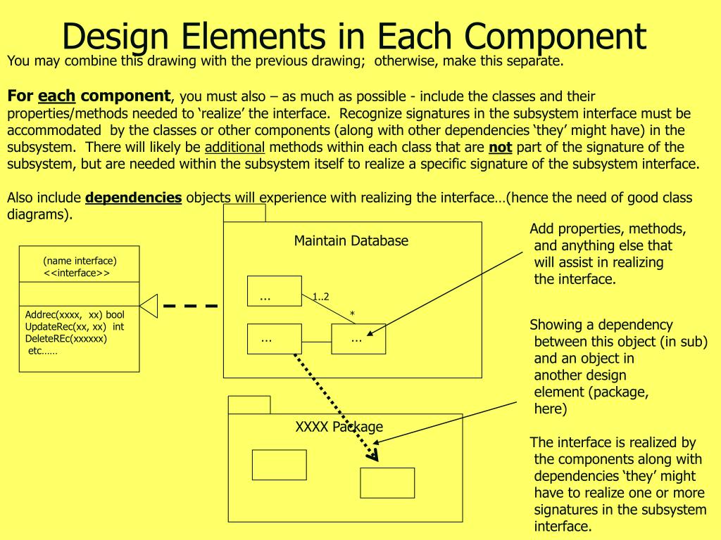Design Elements in Each Component You may combine this drawing with the previous drawing; otherwise, make this separate. For each component, you must also – as much as possible - include the classes and their properties/methods needed to ‘realize’ the interface. Recognize signatures in the subsystem interface must be accommodated by the classes or other components (along with other dependencies ‘they’ might have) in the subsystem. There will likely be additional methods within each class that are not part of the signature of the subsystem, but are needed within the subsystem itself to realize a specific signature of the subsystem interface. Also include dependencies objects will experience with realizing the interface…(hence the need of good class diagrams). Add properties, methods, and anything else that will assist in realizing the interface. Maintain Database (name interface) <<interface>> … 1..2 Addrec(xxxx, xx) bool UpdateRec(xx, xx) int DeleteREc(xxxxxx) etc…… * Showing a dependency between this object (in sub) and an object in another design element (package, here) The interface is realized by the components along with dependencies ‘they’ might have to realize one or more signatures in the subsystem interface. … … XXXX Package